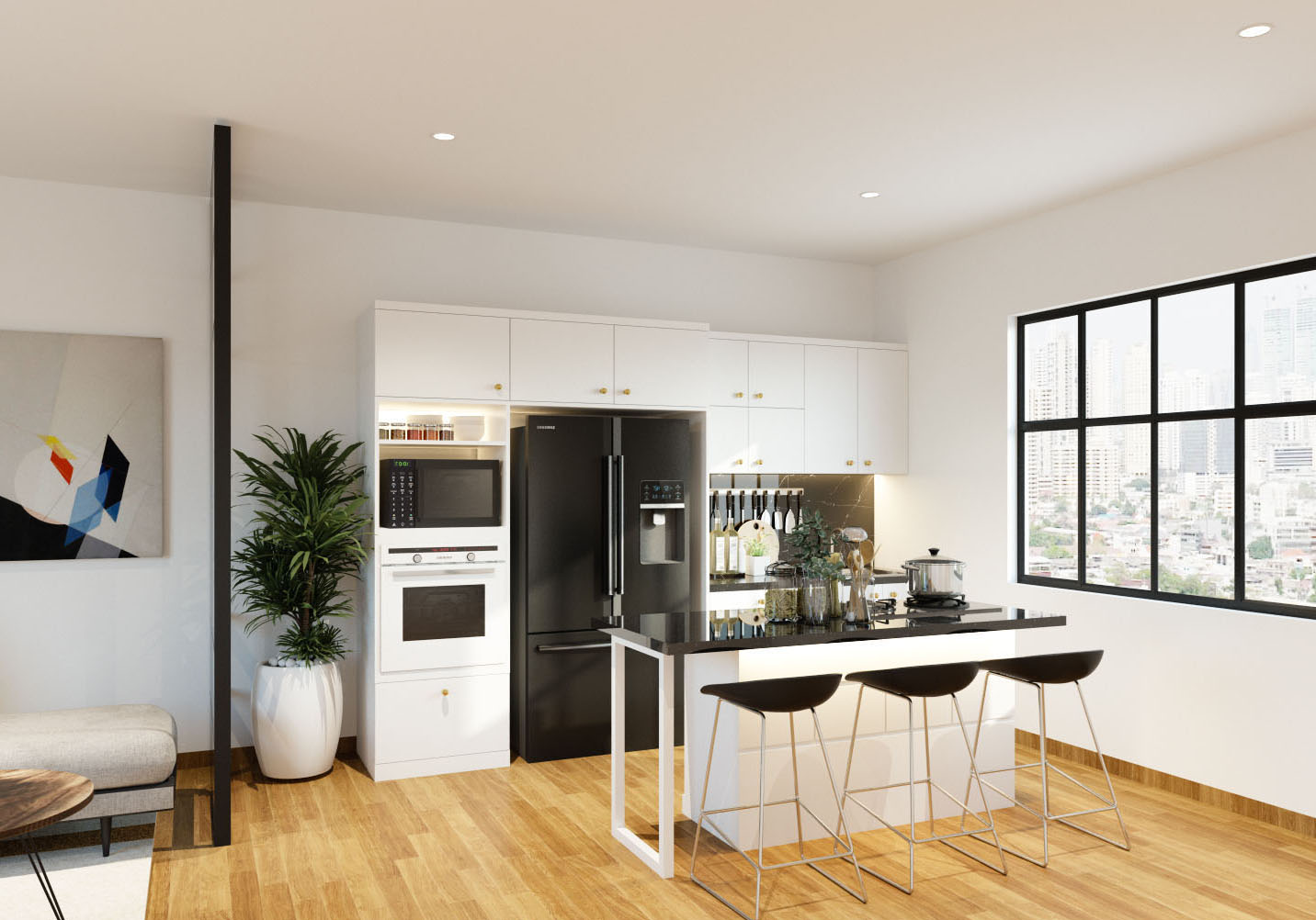 Detail : Dapur putih sering menjadi pilihan, tampilan yang sederhana, clean namun tetap elegan banyak diminati. Perpaduan kabinet putih dengan backsplash hitam pada Vienna menampilkan kesan simpel dan elegan. Penggunaan handle pada kabinet juga menjadi detail yang menarik pada desain ini.