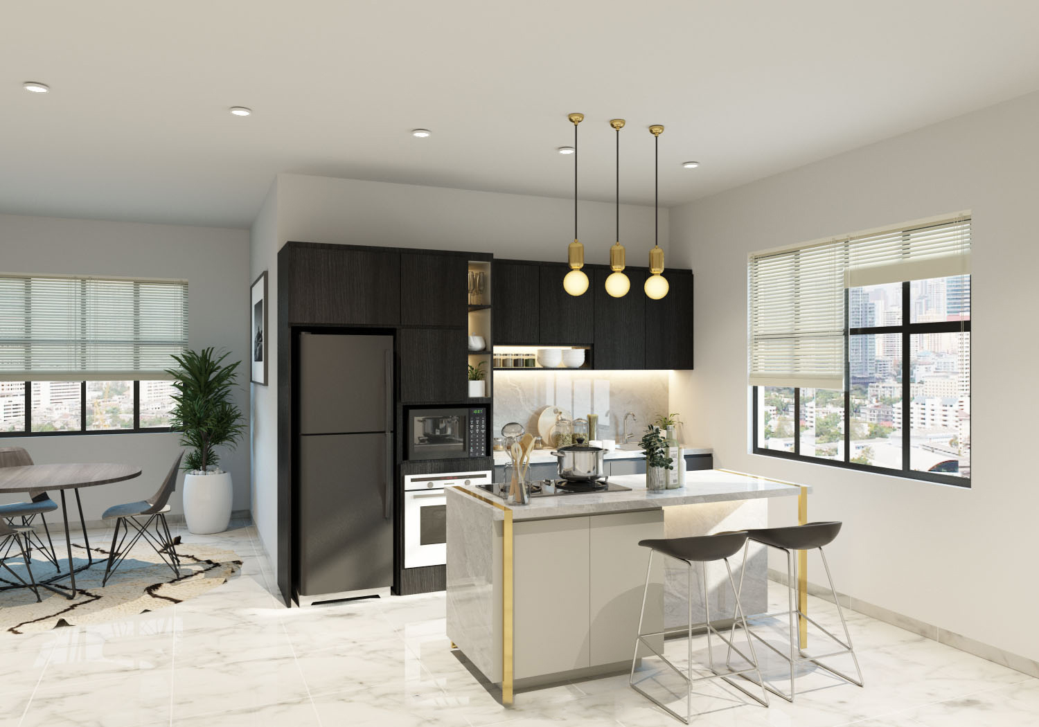 Detail : Penggunaan warna-warna gelap pada cabinet dapur yang dikombinasikan dengan backsplash warna abu memberikan kesatuan yang apik. Desain meja island yang unik menjadi daya tarik tersendiri pada desain ini.