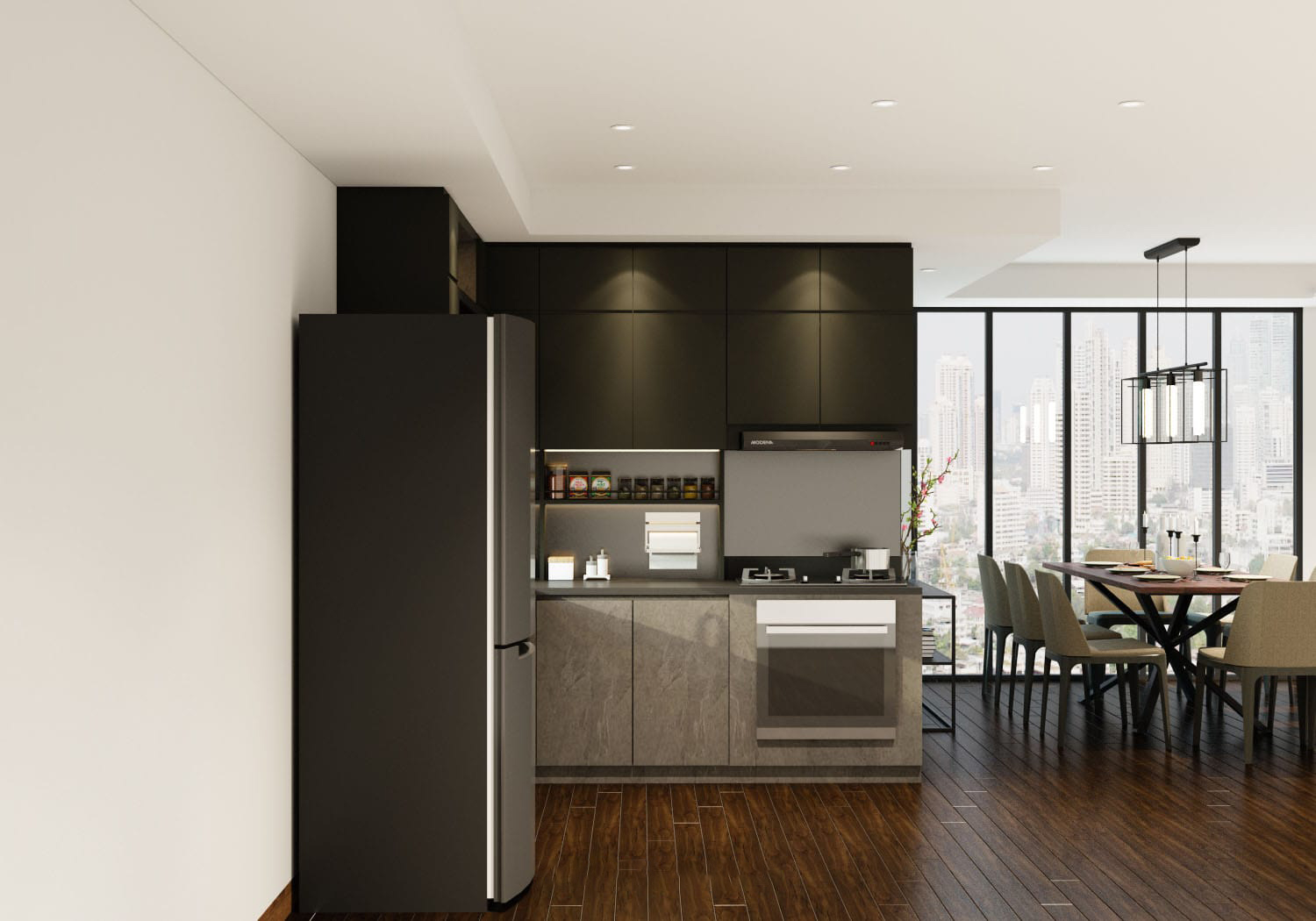 Detail : Design bergaya industrial yang umumnya menggunakan material rough-unfinished, bisa juga di ganti dengan material yang lebih modern. Seperti pada kitchen set ini, material concrete digunakan sebagai pelapis kabinet dapur, dipadukan dengan auluminium dan kaca. Suasana industrial yang chic serta modern minimalis pun membuat dapur jadi elegan dan stylish.